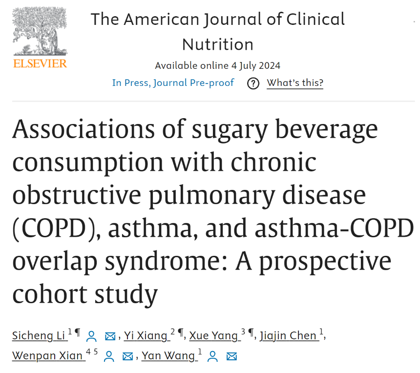 Li S, Xiang Y, Yang X, Chen J, Xian W, Wang Y. Associations of sugary beverage consumption with chronic obstructive pulmonary disease, asthma, and asthma-chronic obstructive pulmonary disease overlap syndrome: a prospective cohort study. Am J Clin Nutr. Published online July 4, 2024. doi:10.1016/j.ajcnut.2024.07.001