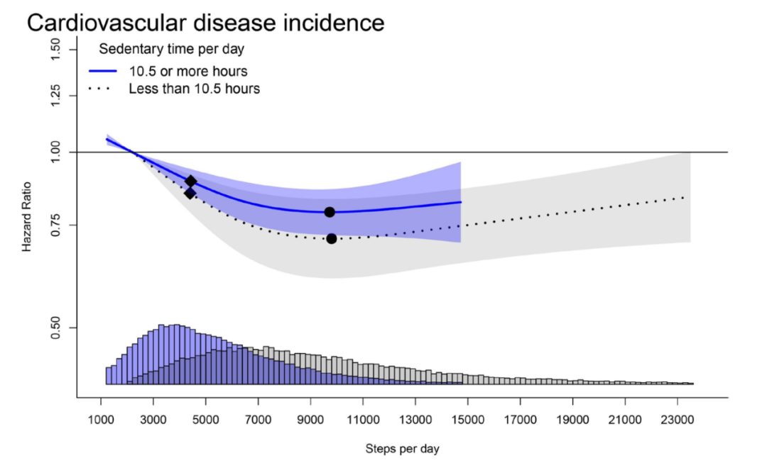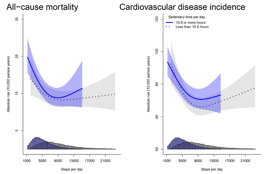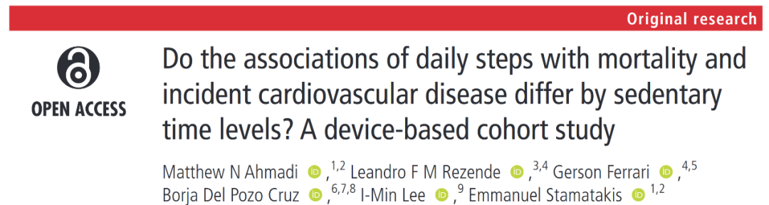 Ahmadi MN, Rezende LFM, Ferrari G, Del Pozo Cruz B, Lee IM, Stamatakis E. Do the associations of daily steps with mortality and incident cardiovascular disease differ by sedentary time levels? A device-based cohort study. Br J Sports Med. 2024;58(5):261-268. Published 2024 Mar 8. doi:10.1136/bjsports-2023-107221