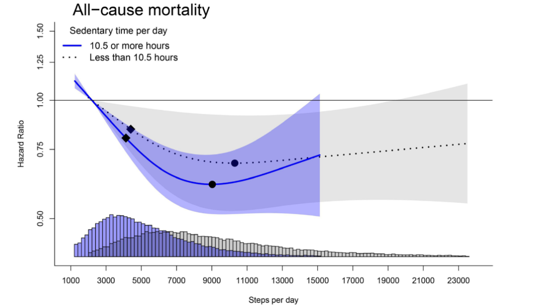 对于低久坐时间组(<10.5小时/天),全因死亡率的最低风险则出现在每天10300步,HR为0.69(95% CI 0.52至0.92)。换句话说,不管你是不是经常坐着,如果你每天走9000到10500步,你的死亡风险都会显著降低。