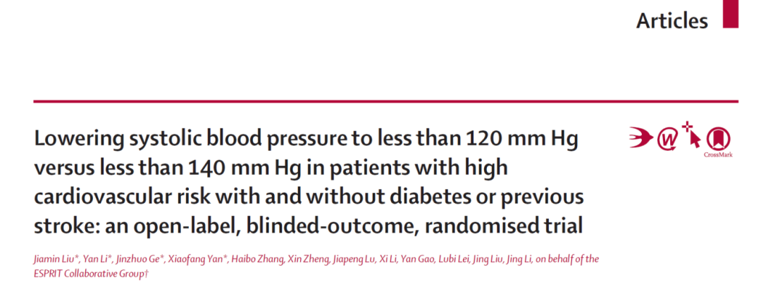 近日,阜外医院和北京协和医学院的研究团队在《柳叶刀》杂志上发表的一项题为“Lowering systolic blood pressure to less than 120 mm Hg versus less than 140 mm Hg in patients with high cardiovascular risk with and without diabetes or previous stroke: an open-label, blinded-outcome, randomised trial”的研究中,发现将收缩压目标定在低于120毫米汞柱(mmHg)可以显著降低心血管疾病高风险患者发生重大心血管事件的风险。这项名为“强化收缩压降低治疗对减少血管事件风险的影响(ESPRIT)”的试验,为降压治疗设定了新的目标。