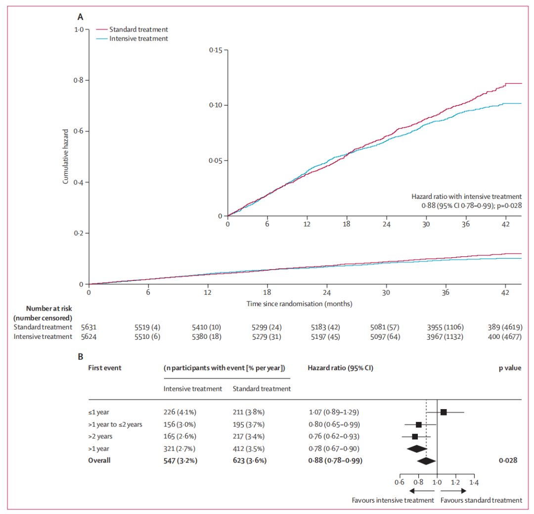 结果出来后发现,经过几年的跟踪观察,那些更努力降血压的人(强化治疗组),他们的平均血压更低,而且心脏病、中风等心血管问题的发生率也更低。具体来说,强化治疗组的心血管问题发生率是3.5%,而标准治疗组是4.6%。