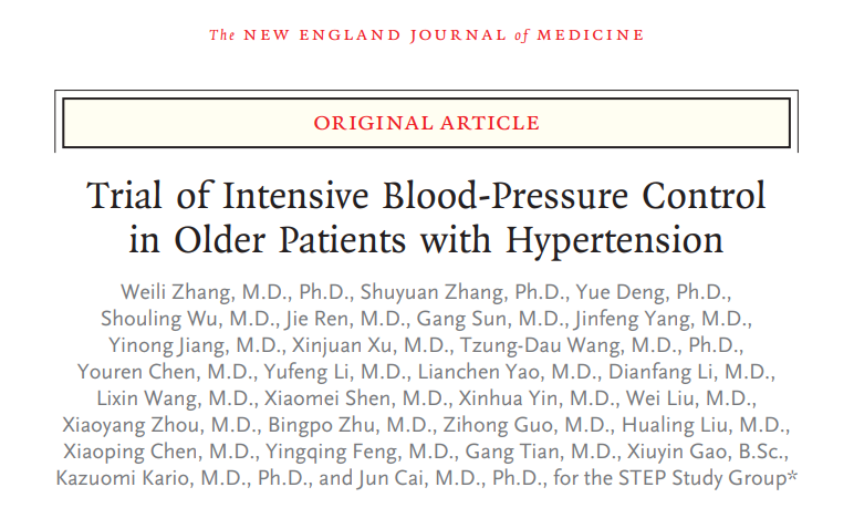 3. Zhang W, Zhang S, Deng Y, Wu S, Ren J, Sun G, Yang J, Jiang Y, Xu X, Wang TD, Chen Y, Li Y, Yao L, Li D, Wang L, Shen X, Yin X, Liu W, Zhou X, Zhu B, Guo Z, Liu H, Chen X, Feng Y, Tian G, Gao X, Kario K, Cai J; STEP Study Group. Trial of Intensive Blood-Pressure Control in Older Patients with Hypertension. N Engl J Med. 2021 Sep 30;385(14):1268-1279. doi: 10.1056/NEJMoa2111437.