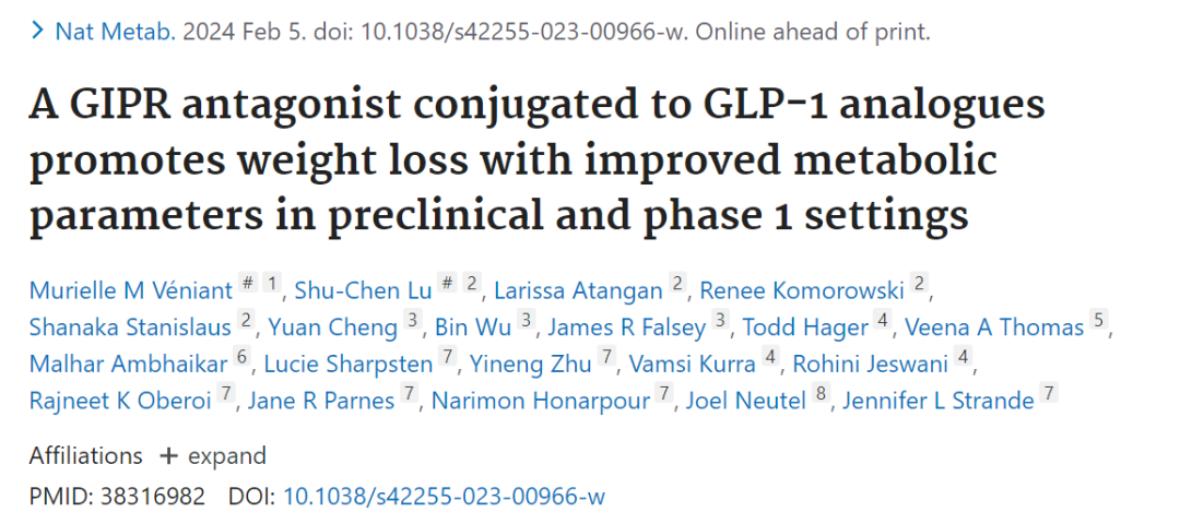 [1] Véniant MM, Lu SC, Atangan L, et al. A GIPR antagonist conjugated to GLP-1 analogues promotes weight loss with improved metabolic parameters in preclinical and phase 1 settings. Nat Metab. Published online February 5, 2024. doi:10.1038/s42255-023-00966-w