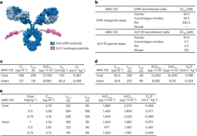 AMG 133是一种优化的GIPR/GLP-1R双特异性分子,由全人源单克隆抗GIPR抗体与两个GLP-1类似物激动剂多肽缀合而成。