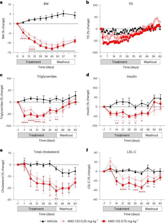 进一步,研究人员对肥胖食蟹猴开展了实验,每周皮下注射0.25 mg/kg或0.75 mg/kg AMG 133,持续6周注射可以显著降低肥胖食蟹猴体重、血糖、血浆胰岛素水平和脂质水平,且肥胖食蟹猴食物摄入量减少。治疗期结束后,接受0.25 mg/kg或0.75 mg/kg AMG 133注射的肥胖食蟹猴体重降低了11%-13%。