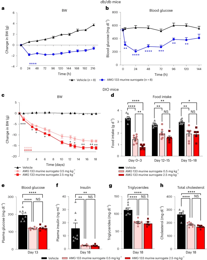 研究人员给予肥胖小鼠2 mg/kg药物,发现小鼠体重在24h时体重下降最多,且在注射216h内依然存在着减重效果;注射4h后开始观察到降糖作用,且这一效果可以持续144h,此外,还发现小鼠食物摄入量显著降低,血糖、血浆胰岛素水平以及脂质水平均显著降低。