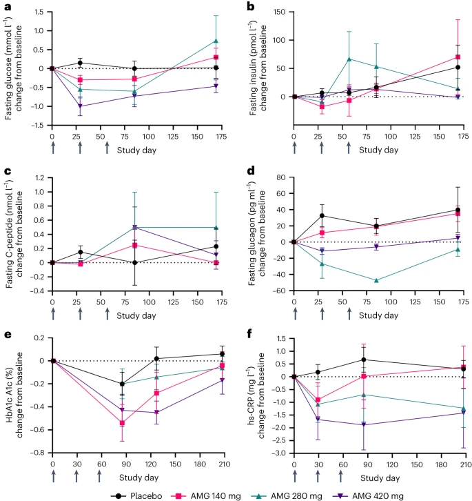 在针对肥胖患者的1期随机、双盲、安慰剂对照的临床研究(NCT04478708)中,肥胖症参与者接受了不同剂量的AMG 133注射,在单剂量递增队列中,AMG 133的剂量范围从21mg至840mg。在多剂量递增队列中,AMG 133的剂量范围从140mg至420mg,每30天接受一次治疗。