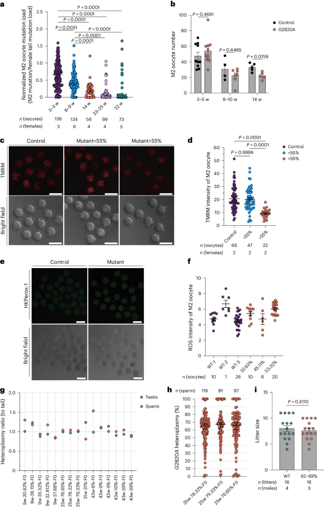 结果发现,在ND1突变小鼠中,随着母鼠年龄的增加,成熟卵母细胞(M2卵母细胞)的突变负荷显著下降。例如,3-4周龄小鼠的M2卵母细胞突变负荷为65.5%,8周龄为43.11%,14周龄为18.45%,23周龄以上降至10%以下。研究人员推测,突变负荷较高的卵母细胞可能无法受精或无法支持正常胚胎发育,因为他们无法从这些年长雌性小鼠中获得突变负荷较高的幼鼠。