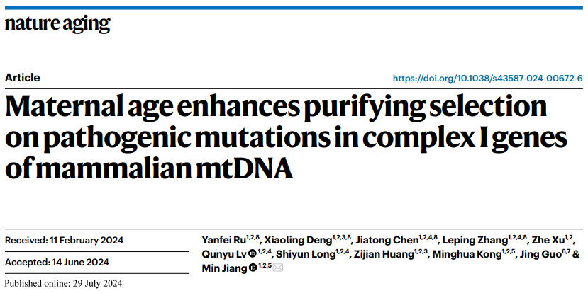 1. Ru, Y., Deng, X., Chen, J. et al. Maternal age enhances purifying selection on pathogenic mutations in complex I genes of mammalian mtDNA. Nat Aging (2024). https://doi.org/10.1038/s43587-024-00672-6