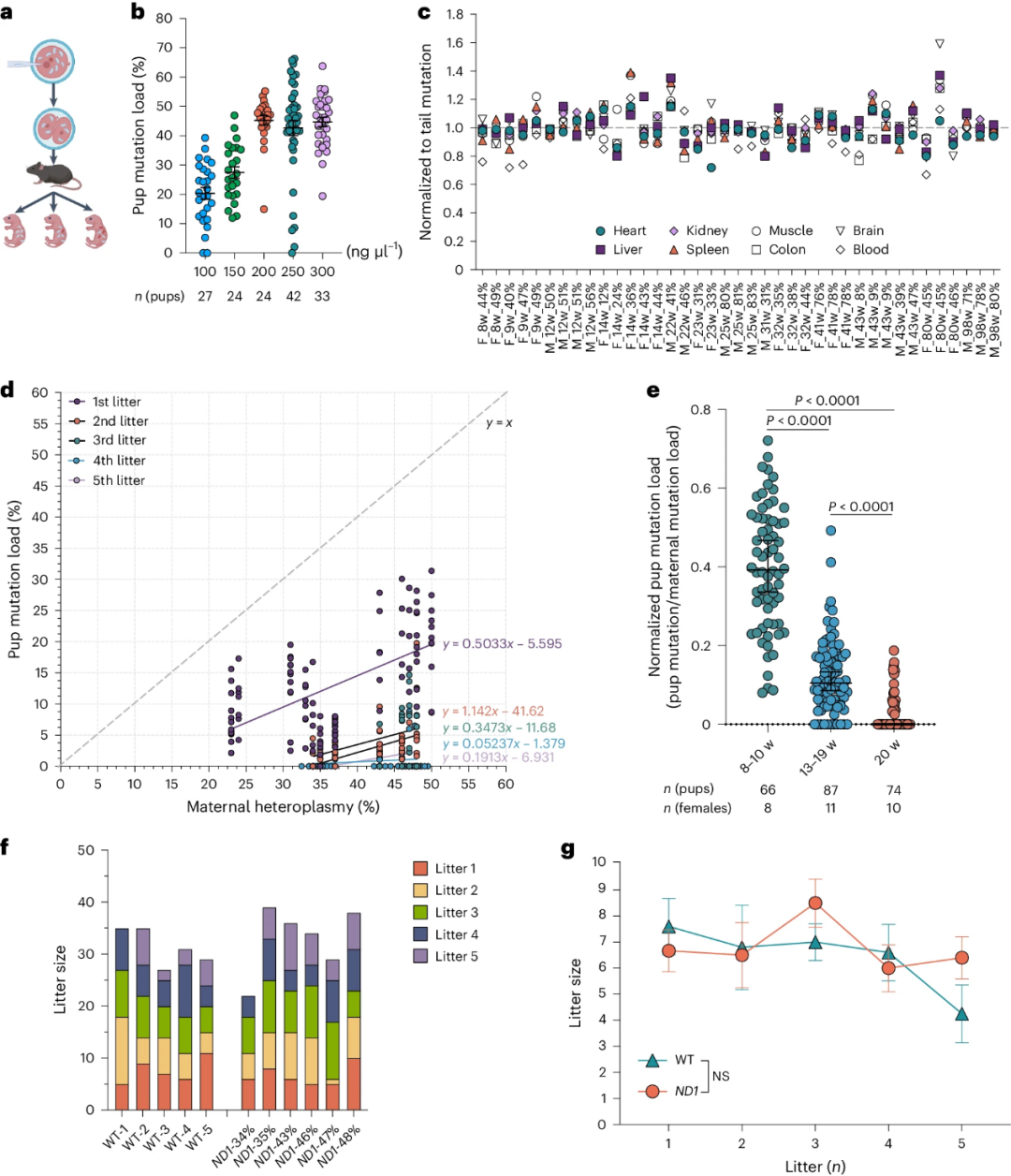 为了深入探究净化选择与母体年龄之间的联系,研究团队继续对幼崽的相对突变负荷(即与它们母体相比的突变量)以及母体怀孕时的年龄进行了详细分析。结果发现,当母鼠年龄达到20周时(3个月或12周大的小鼠通常被认为达到了性成熟,相当于人类的20岁左右),它们所生育的幼崽ND1基因突变的负荷极低,甚至完全没有突变(图1e)。这一发现表明,随着母鼠年龄的增长,其传递给后代的ND1基因突变可能受到了更为严格的自然筛选。