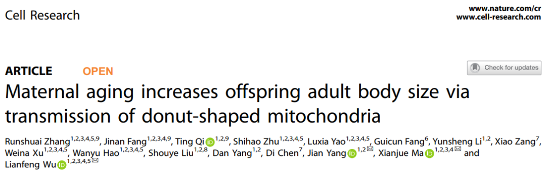 2. Zhang, R., Fang, J., Qi, T. et al. Maternal aging increases offspring adult body size via transmission of donut-shaped mitochondria. Cell Res 33, 821–834 (2023). https://doi.org/10.1038/s41422-023-00854-8