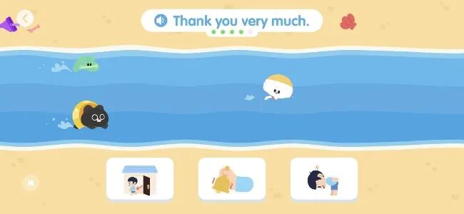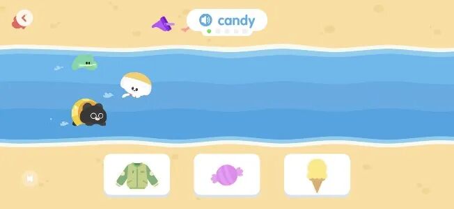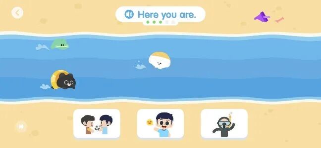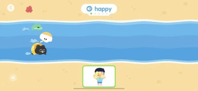 当然,简单的英语单词游戏也是让孩子开口很好的方式,比如简单的“单词短语游泳接力”,当屏幕的一个单词或短语被读出时,屏幕底端会出现三个图片选项,孩子需要点击正确表达词汇含义的图片后,接力才能进行👇