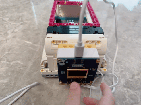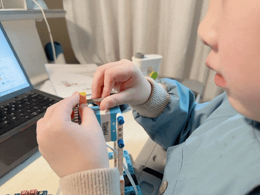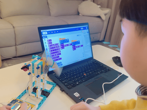 比如小团子最近才完成的「电风扇」,他现在虽然学到了编程的部分,但每学新的内容前,都必须先完成之前的每一步:搭好积木-加动力片--模块驱动。
