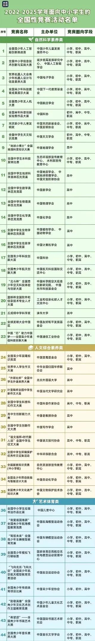 2022-2025中小学全国竞赛活动白名单中:一共44项白名单活动,科创类竞赛活动占了23项👇