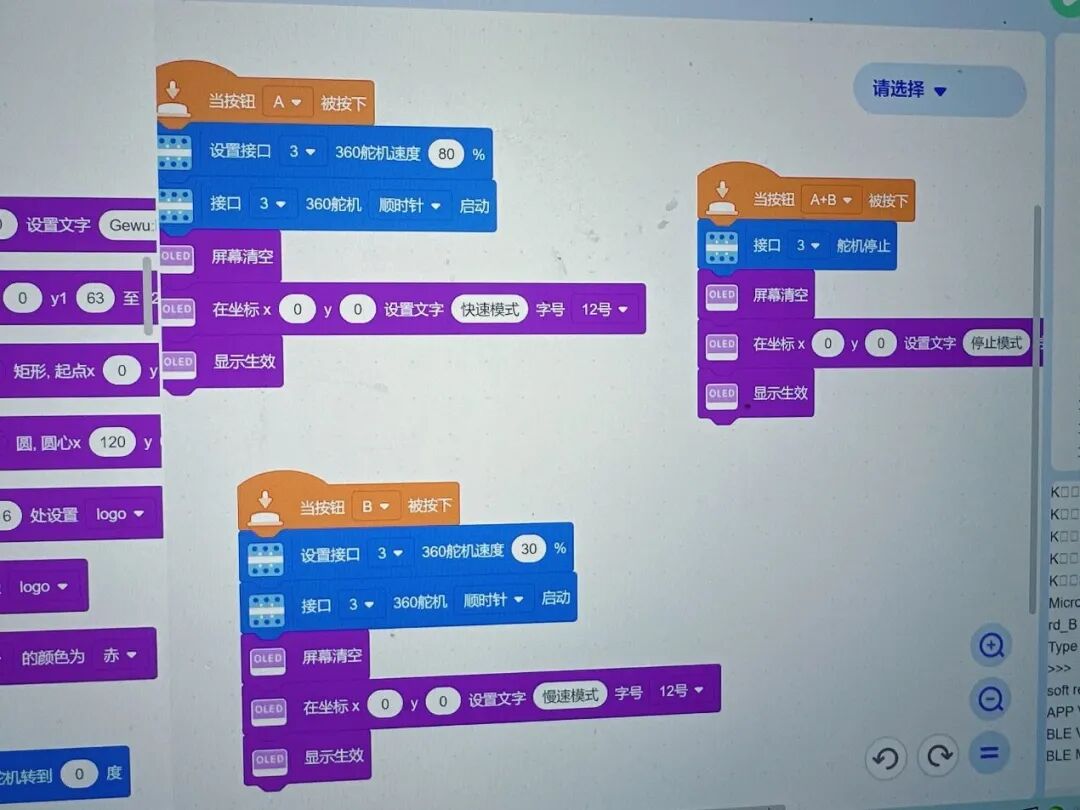 装饰结束了,在下面的编程部分,刚刚说的A键和B键是老师教的,但团子不满足,他觉得,平时咱们用的电风扇怎么可能只有开启键却没有关闭键呢?