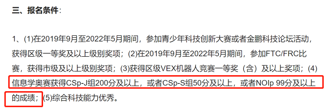 比如,在人大附中的招生简章中,明确要求:信息学奥赛获得CSP-J组200分及以上,或者CSP-S组50分及以上,或者NOIP99分以上的成绩。还有其他多所学校,都将CSP成绩作为科技特长生的衡量标准之一👇
