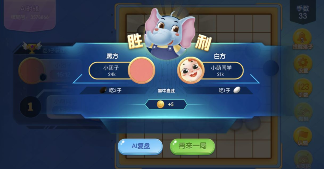 于是乎,在课堂上,最初的几场和班上同学的对弈中,团子一直都在输,平时和AI 对弈以及真人匹配对弈时也都在输。