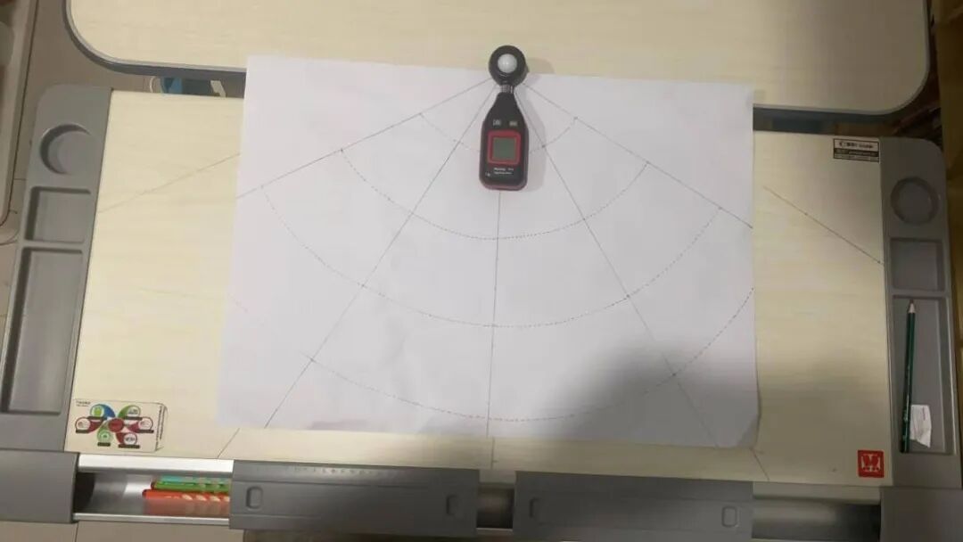 照度和照度均匀度的测试方法和之前的台灯一样,按照 GB/ T9473-2017《读写台灯性能要求》规定的测量参数和点位布局要求,以垂直光源中心 400mm 为产品测试标高,选取半径 300mm、500mm,120° 扇形范围内的 12个点位采用照度仪进行照度测试,再计算其均匀度。