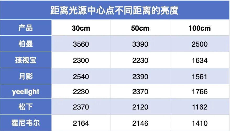 从实测结果来看,三个位置由近及远亮度衰减最明显的是松下,在1米的距离衰减了将近一半的照明亮度,其次是孩视宝、月影和霍尼韦尔,这三款灯做的不行~