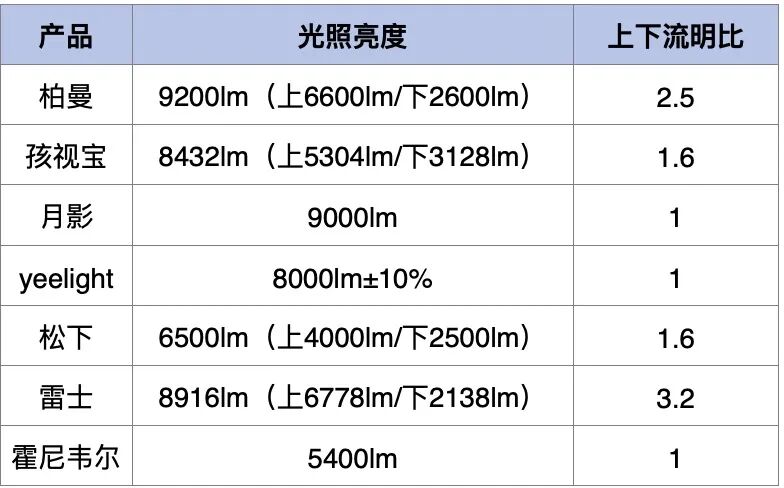 另外,在选择大路灯时,建议大家优先选择上光源的光通量大于下光源的,因为这样才能更好地发挥大路灯漫反射的优势,让室内的整体光环境更加均匀、不晃眼。所以上下灯光通量的对比也是我们这次需要评测的内容。