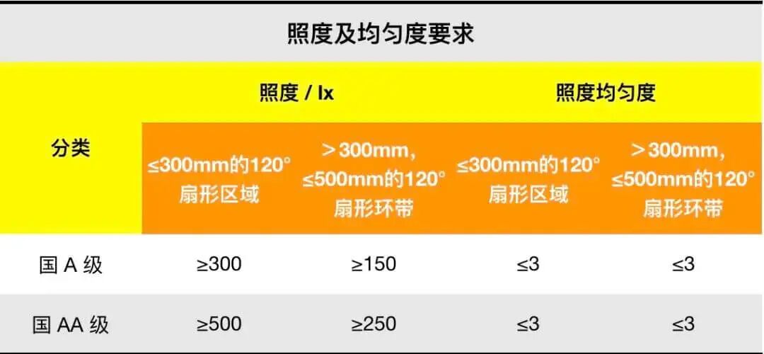 ● 在≤300mm的120º扇形区域应不低于300lx(照度单位:勒克斯lx)
