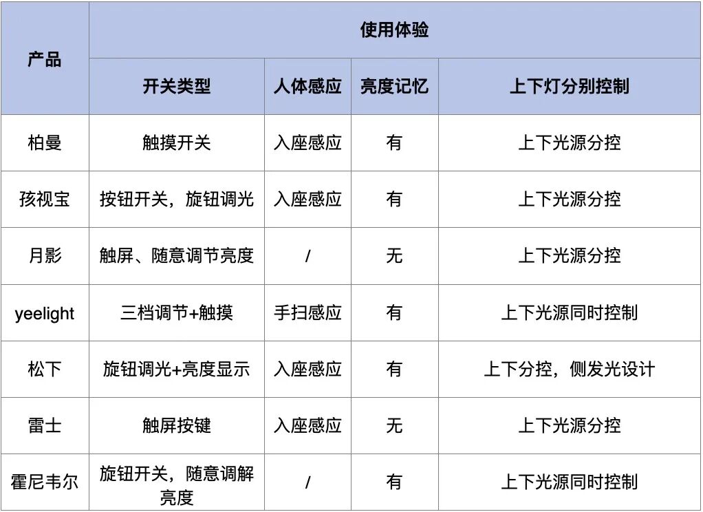 作为一个使用频率,使用体验也是非常重要的,这里我们从开关类型、人体感应、亮度记忆、上下灯分别控制这几个维度去测评。