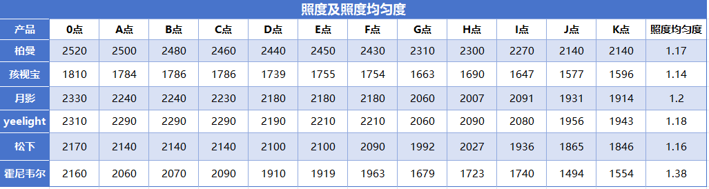 可以看到,所有大路灯的最高亮度,都远超国标的AA级照度,说明在室内只开一盏大路灯就已经完全能够满足日常所有需求。在所有的大路灯里面,柏曼的照度是最高的,所有区域的照度都超过了2000lx,可以打上满分;此外,易来和月影表现也不错。