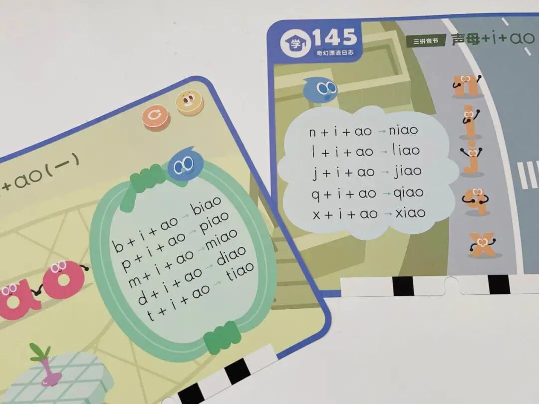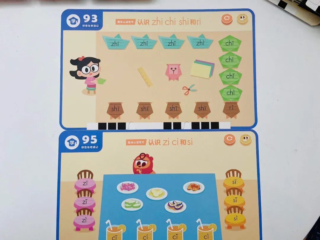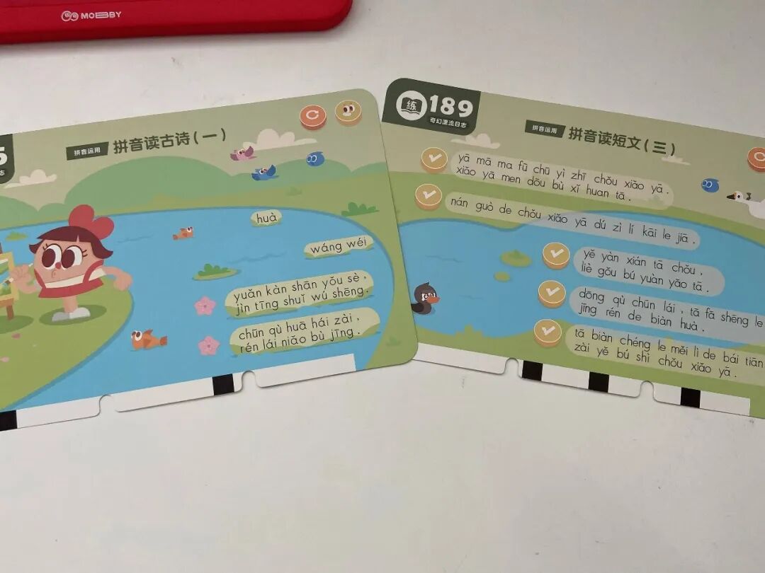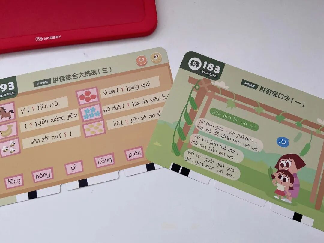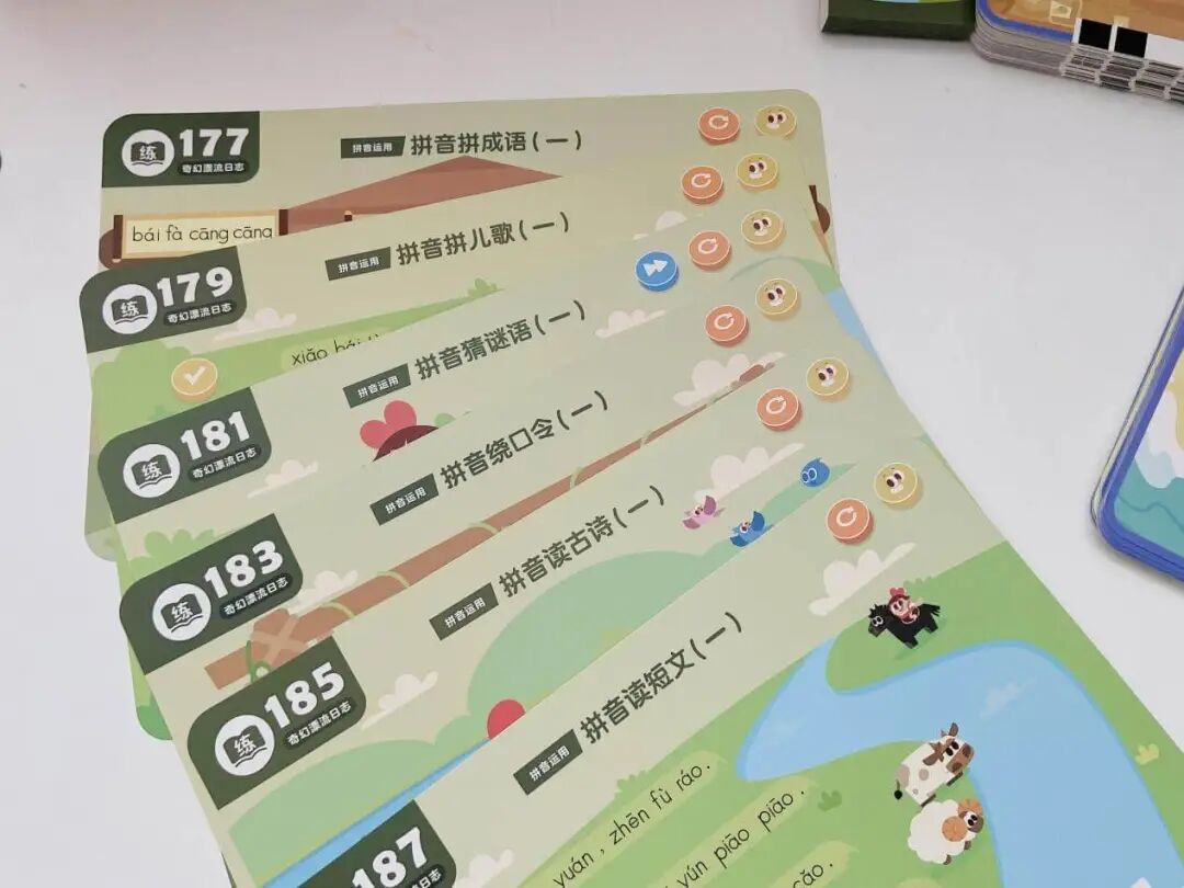 另外一个是奇幻漂流日志(练拼读),主要包含了 11 种三拼音节,以及运用拼音拼读成语、儿歌、古诗、绕口令、谜语、短文等 6大板块。