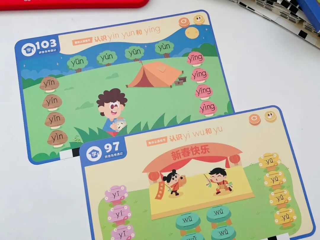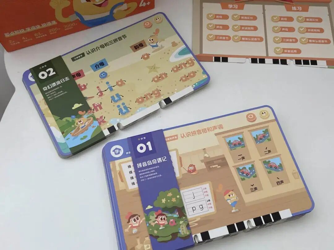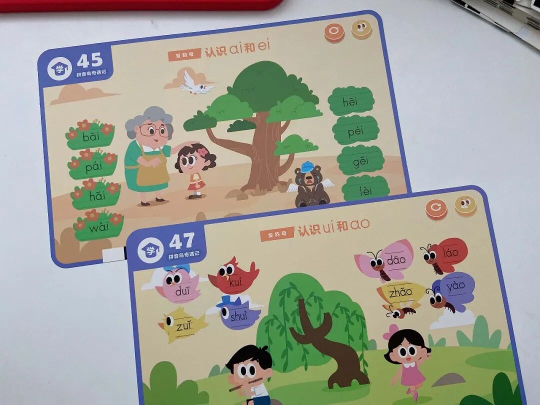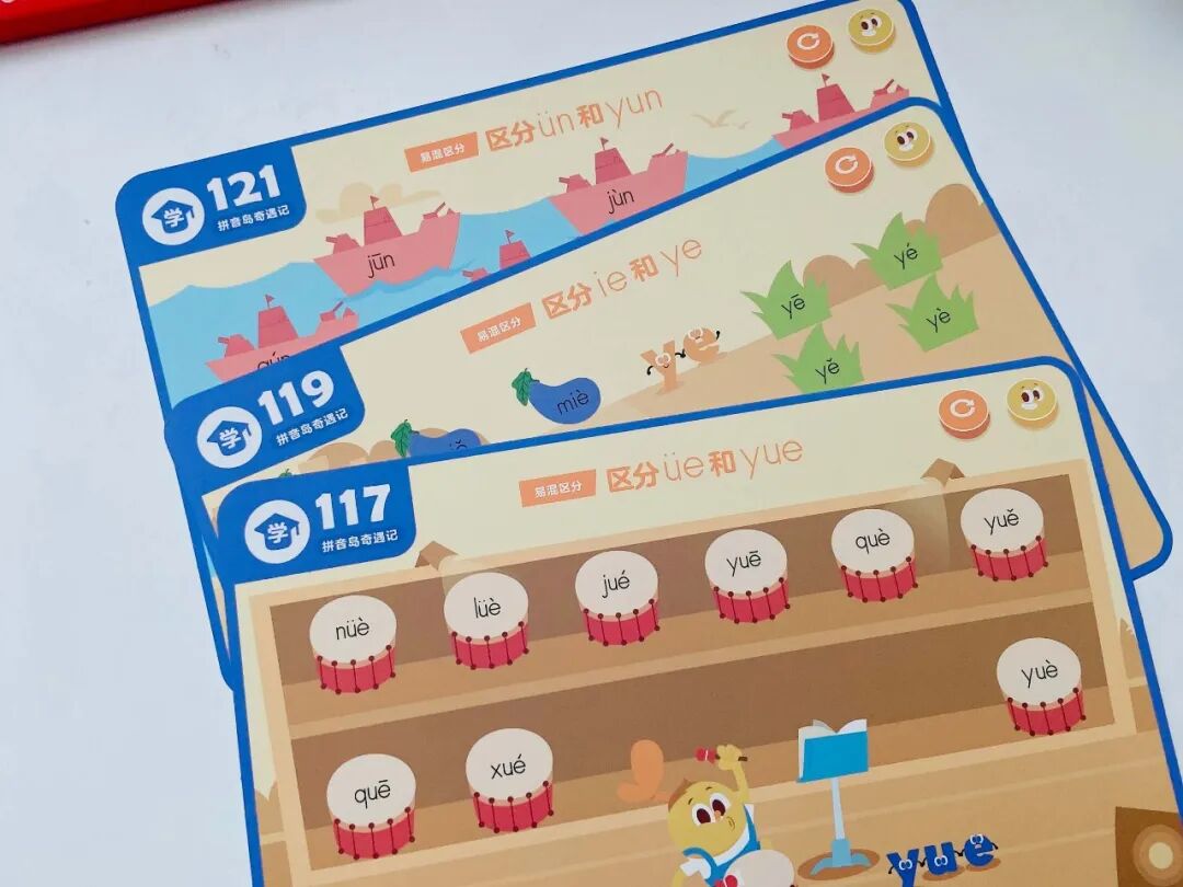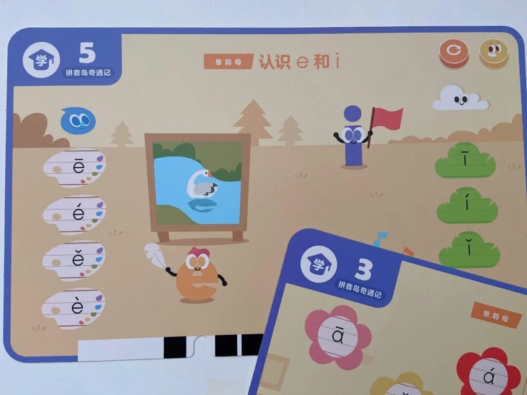 一个是拼音岛奇遇记(学拼音),覆盖了 6 个单韵母、8 个复韵母、1 个特殊韵母、9 个鼻韵母、16 个整体认读音节。