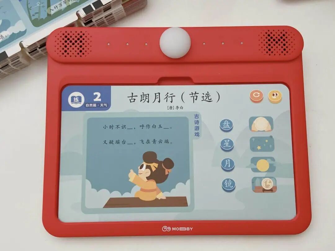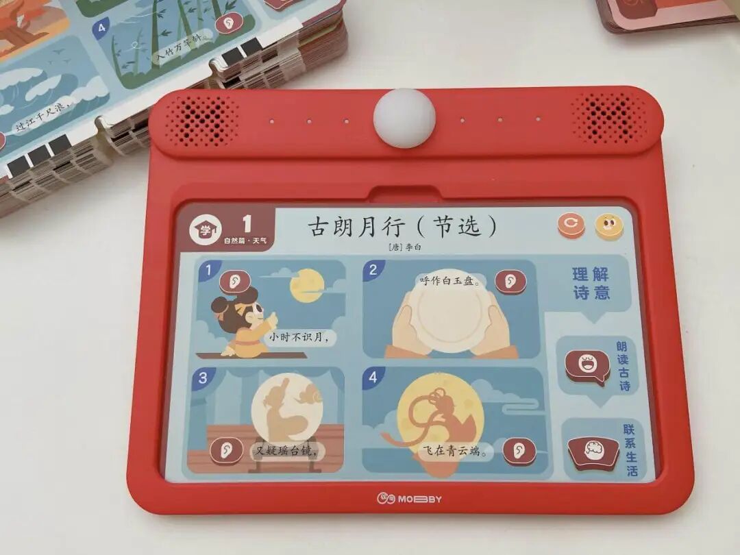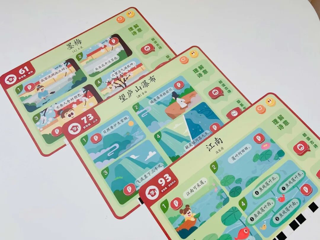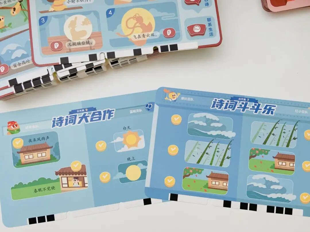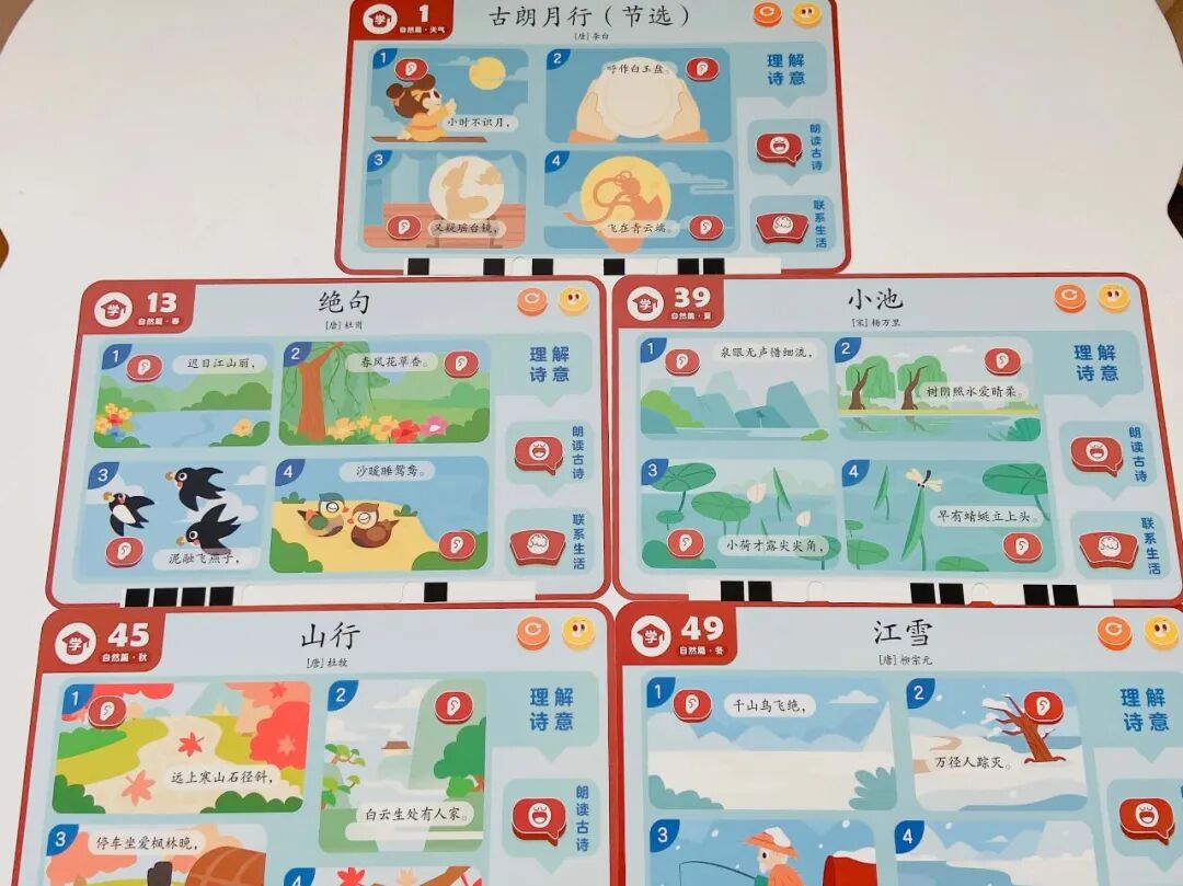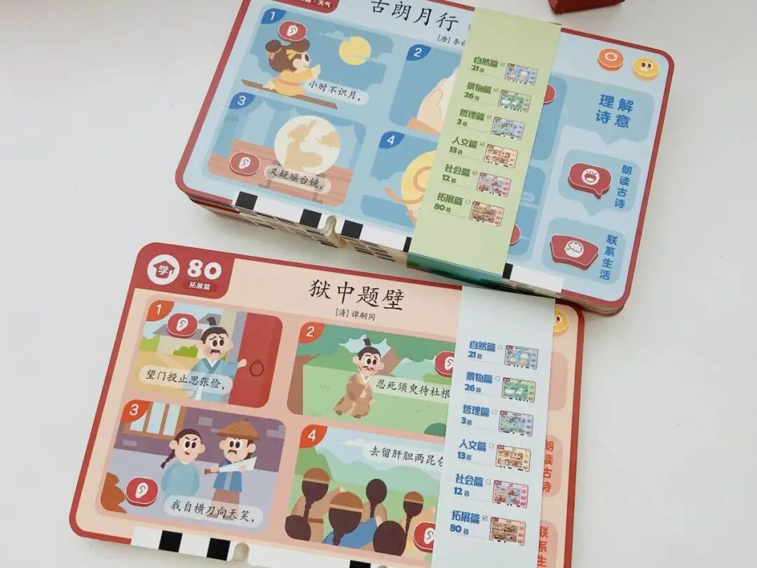 摩比中华古诗词,一套题卡包含了自然篇、静物篇、哲理篇、人文篇、社会篇、拓展篇 6 大诗词主题,集合了 9 个朝代 65 位诗人 155 首古诗词。
