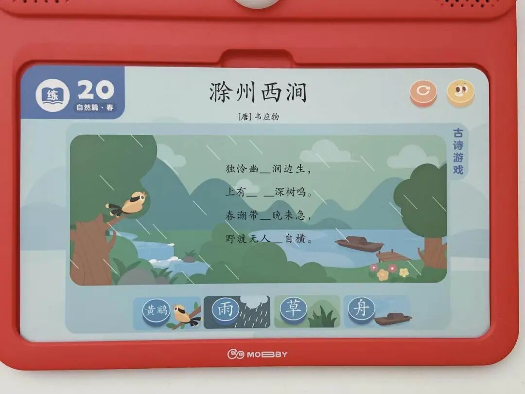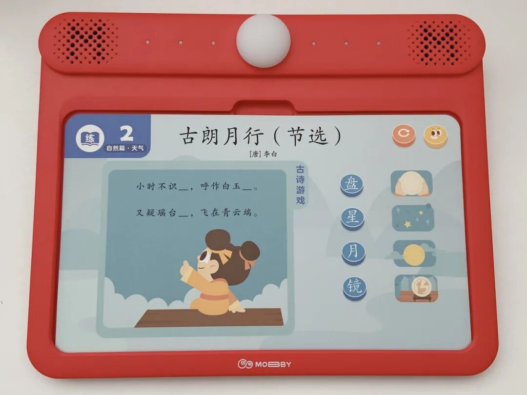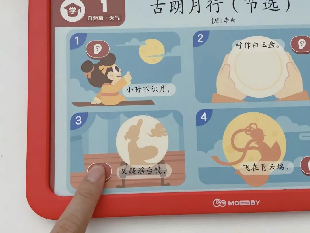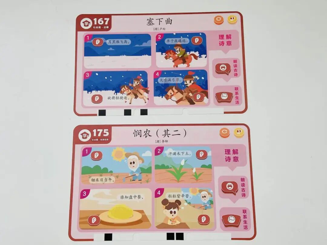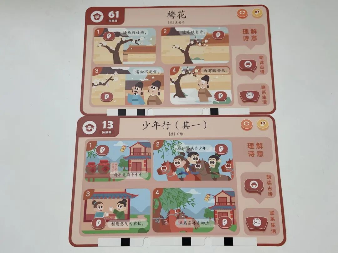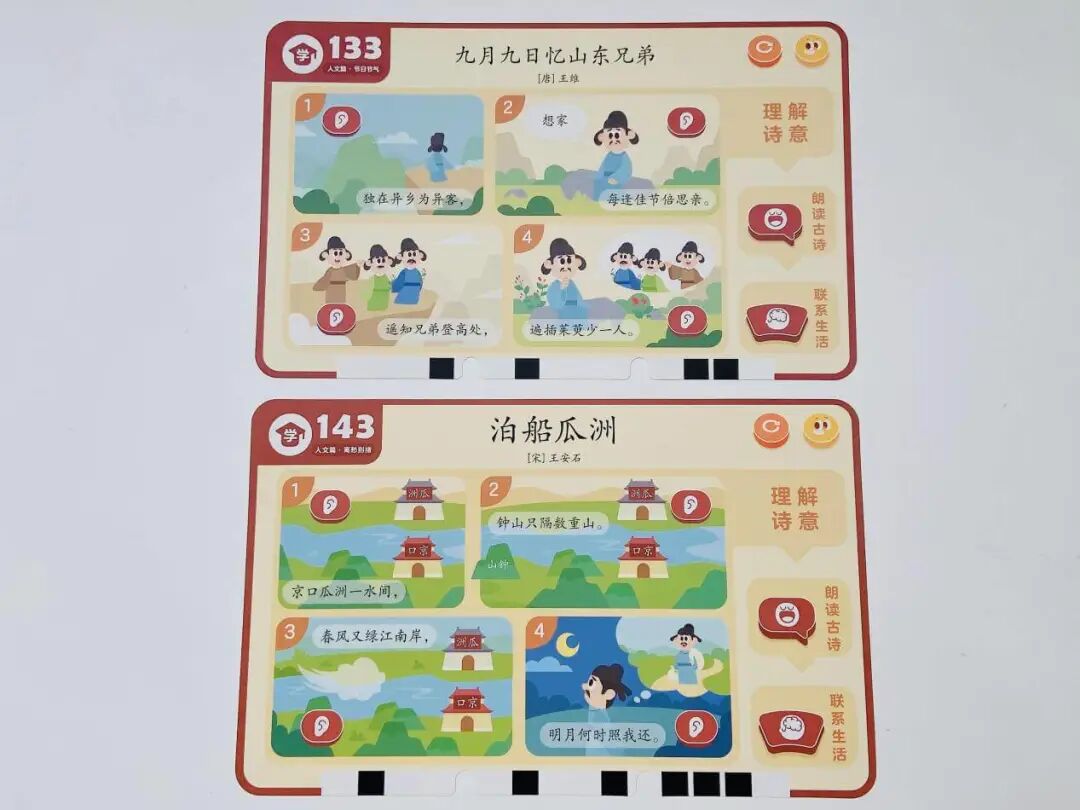 摩比中华古诗词,一套题卡包含了自然篇、静物篇、哲理篇、人文篇、社会篇、拓展篇 6 大诗词主题,集合了 9 个朝代 65 位诗人 155 首古诗词。