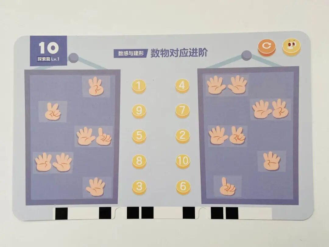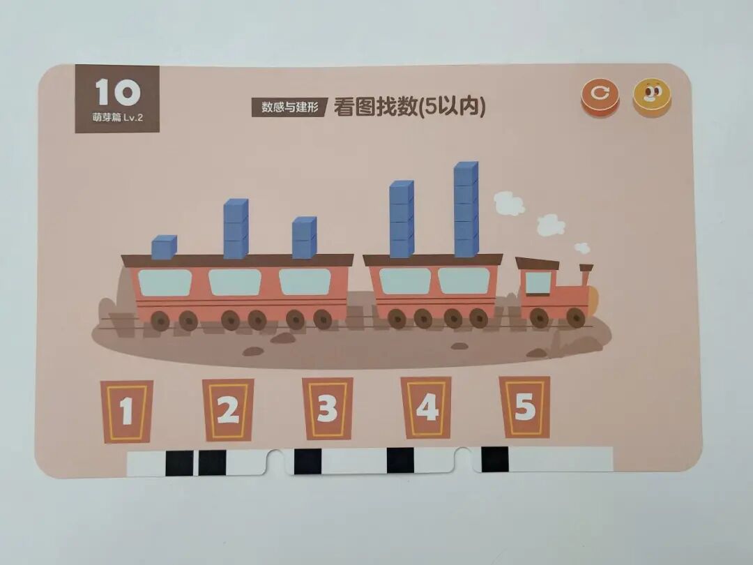 下面这套摩比题卡,就是从最基础的正序点数(1、2、3、4、5)开始,再到倒序点数(5、4、3、2、1),接着是乱序点数(分类),一点点增加训练难度,最后达到小朋友能一眼认数的程度。