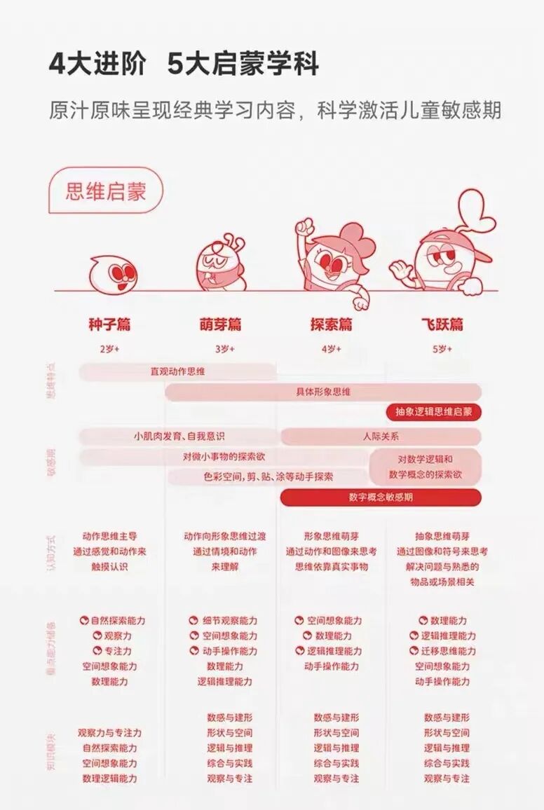 A 共 4 个级别,种子篇、萌芽篇、探索篇、飞跃篇,涵盖了数感与建形、形状与空间、逻辑与推理、综合与实践、观察与专注 5 大知识模块!