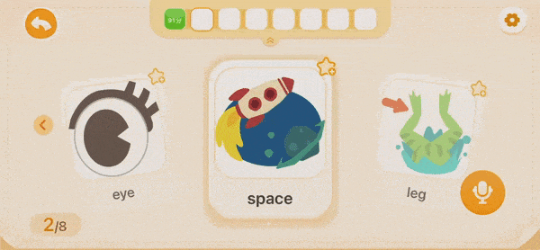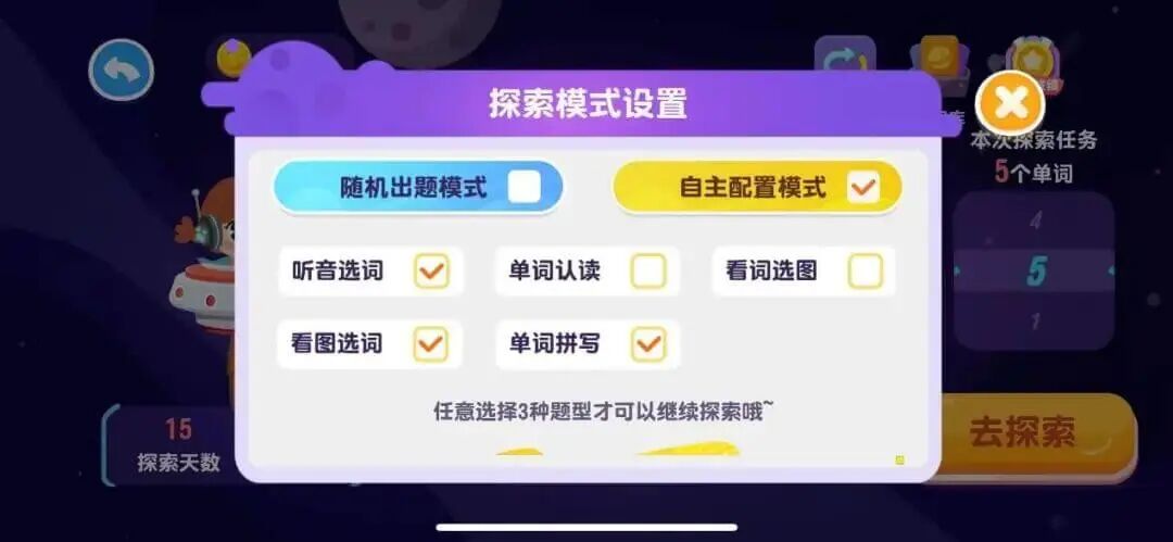 拿“单词星球”来说,整个模块都设计成了团子喜欢的太空探索主题,将把 RAZ 的单词根据级别做了分类,自主配置模式,选择三种题型——“听音选词”、“看图选词”、“单词拼写”👇