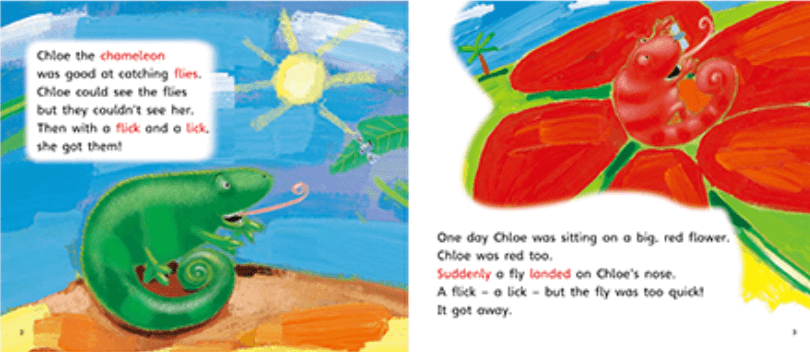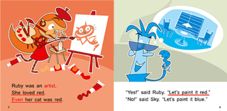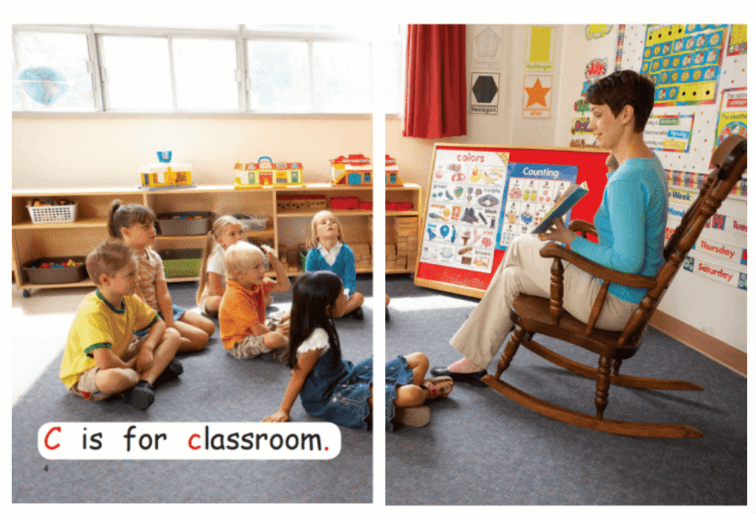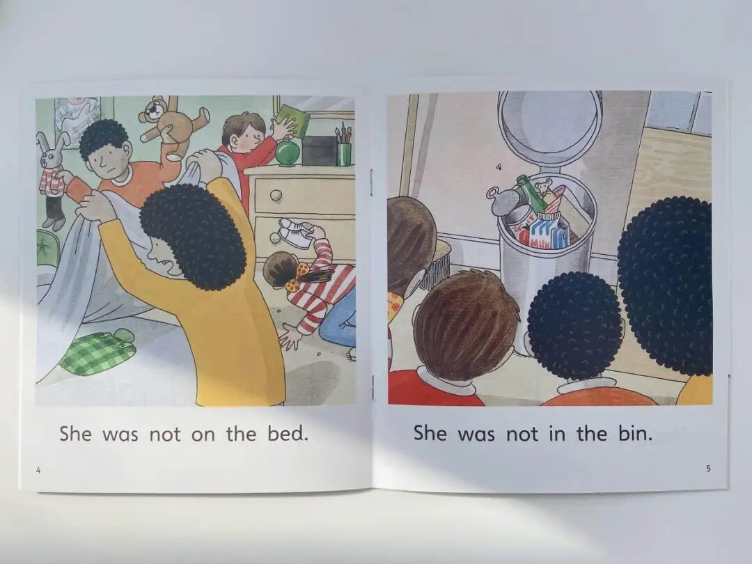 从每一级别的句子结构来说,在 aa 级,每本书的文本,采用一个句式多次重复出现的风格,每句 1-3 个单词,且只有 1 个单词变换,孩子在阅读时候既能熟悉句式又能了解词族的概念。