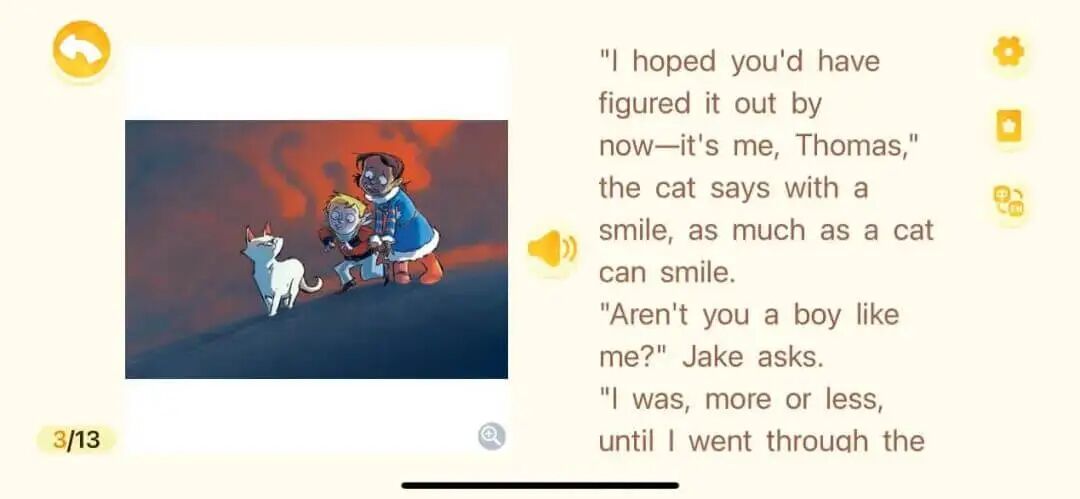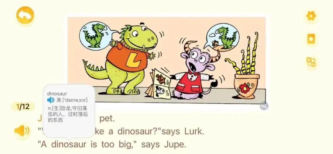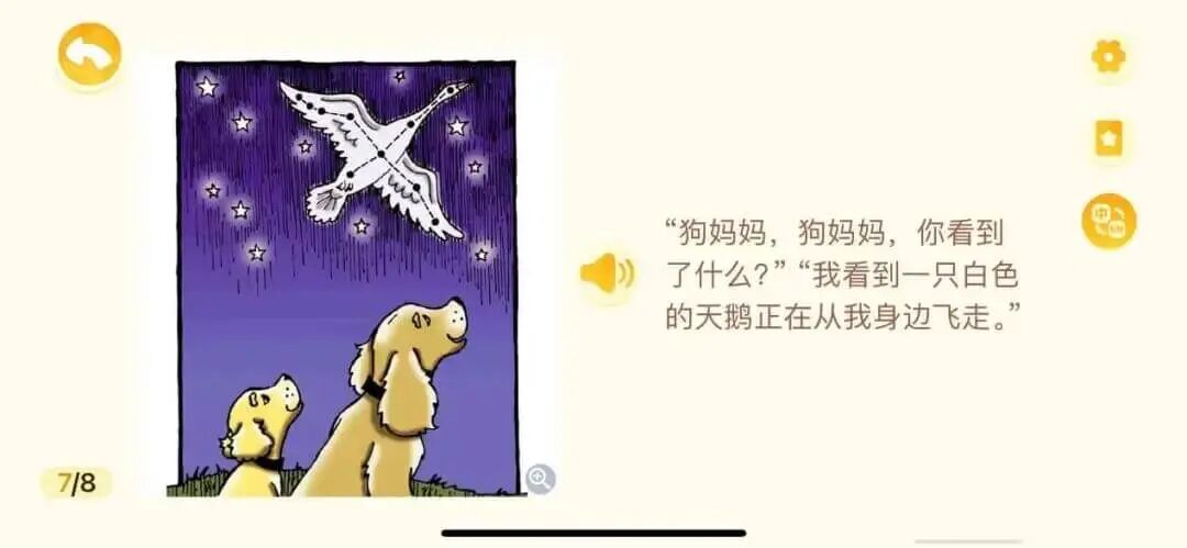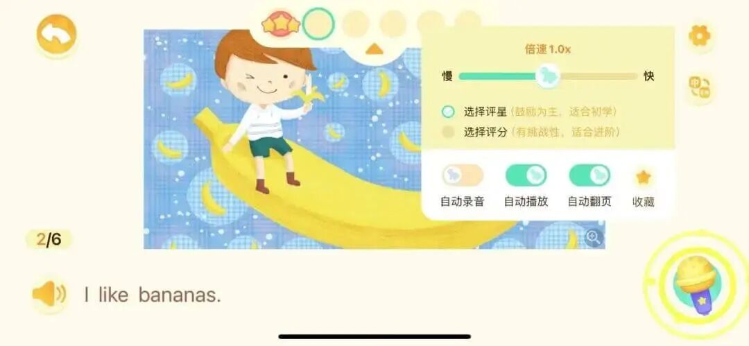 读——这部分的亮点有两个,一有是AI 跟读测评打分的功能,系统会先播放一遍原音,让孩子进行跟读,然后进行评分/评星,每一页都可以进行反复跟读👇