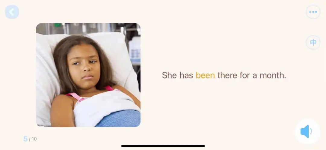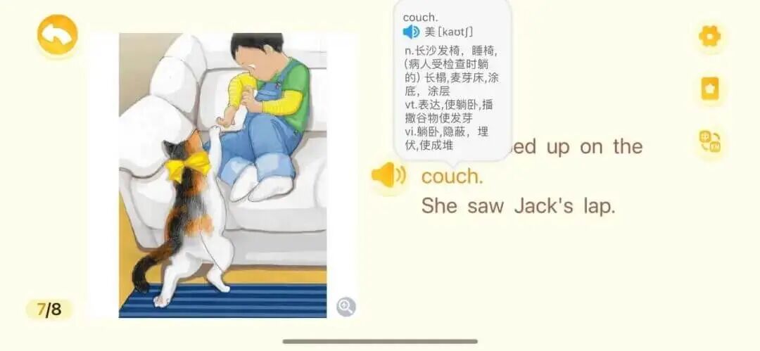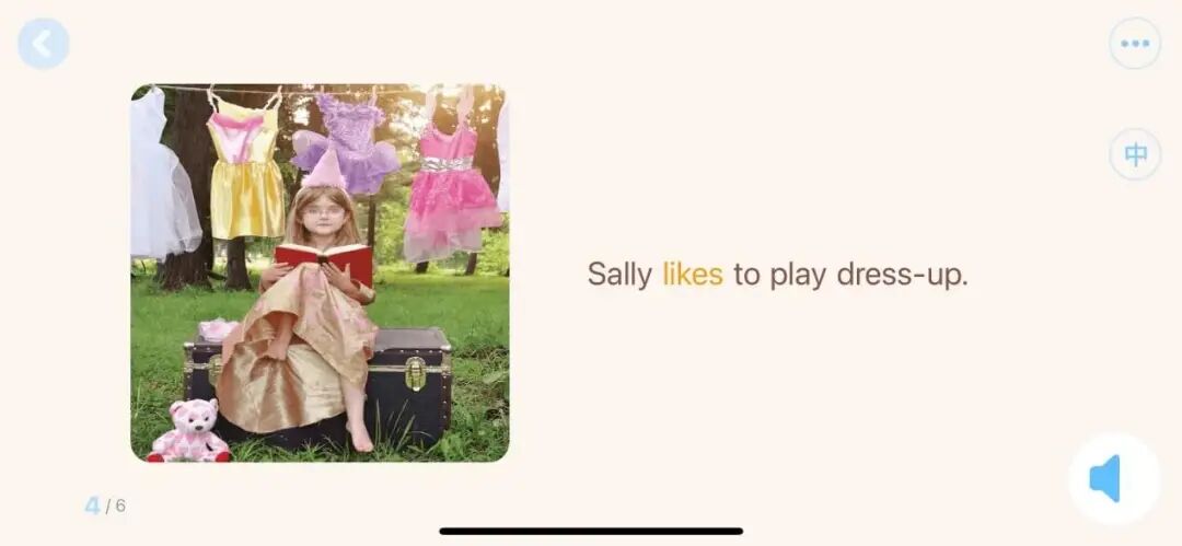 接下来的 D 级别,每页变为 2 句话,每句有 1-3 个单词变换,并且简单句型中包含介词短语,不会的词,孩子只要点击屏幕还会有详解和发音👇