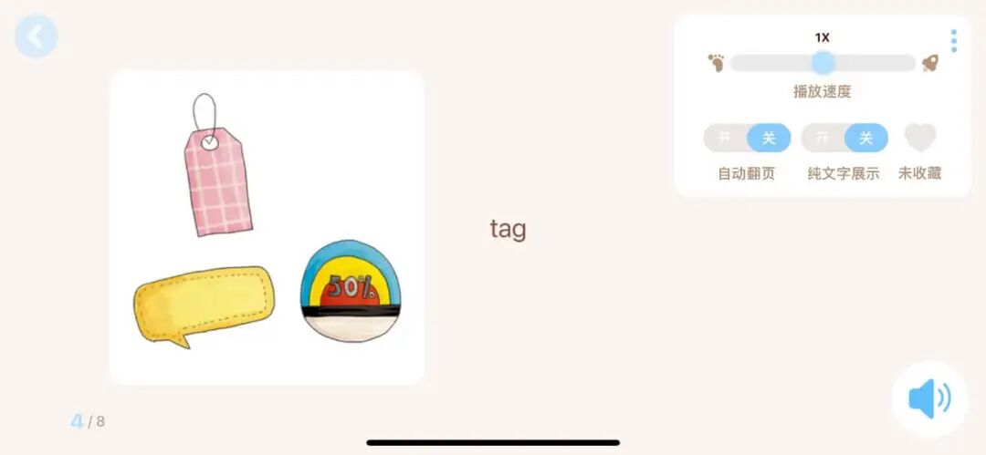 二是可以自己调节音频语速和翻页习惯,还可以点击“中英文切换”,查看中文释义👇