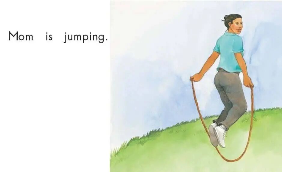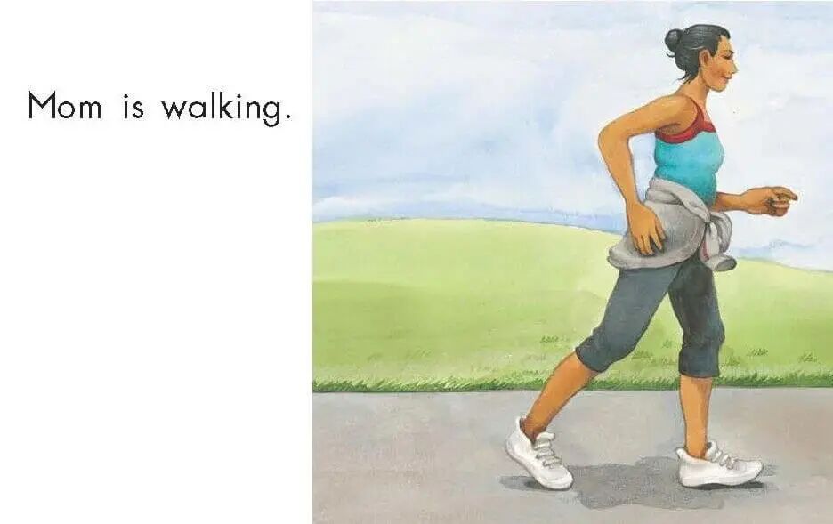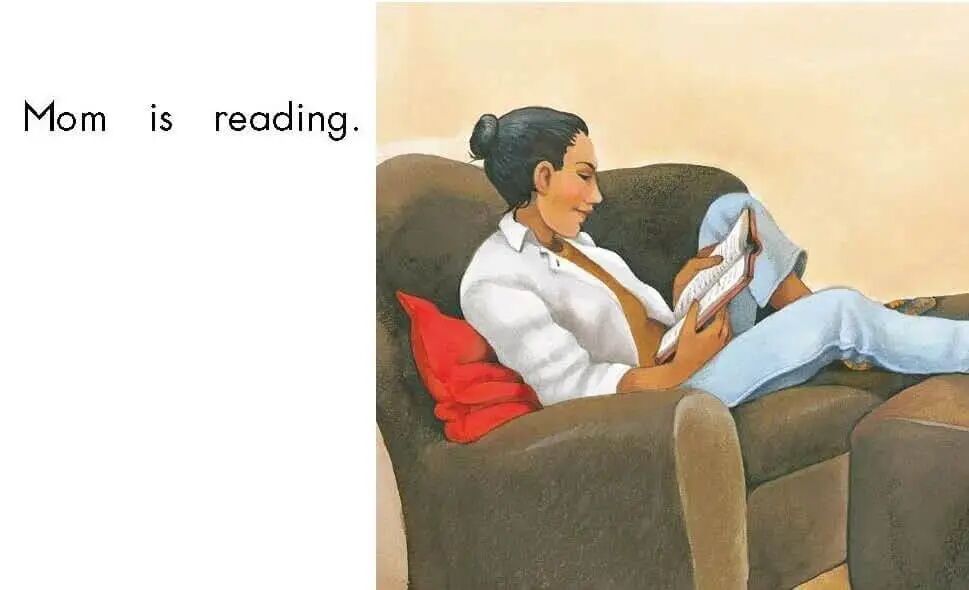 比如 Mom 中,一共8页,都在变换场景重复一个句式——Mom is doing something👇