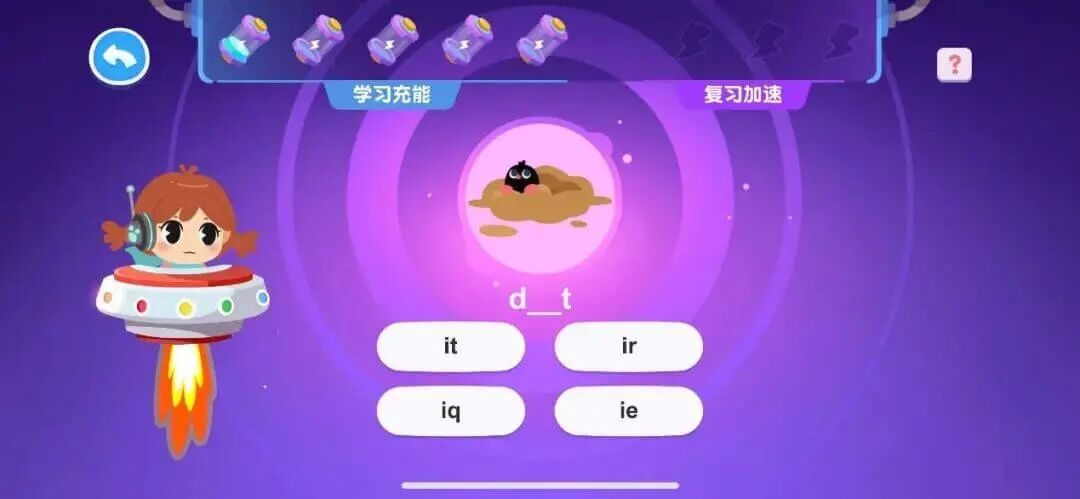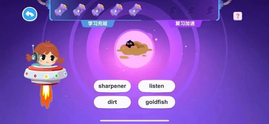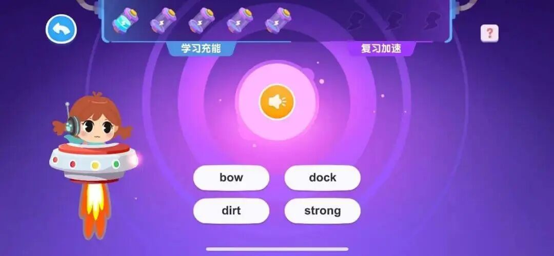 设置好后,游戏就会将每个新单词从“形、音、义”三种形式复现3次,帮助孩子全方位地拿下每个单词,孩子每答对一题,就可以获得一份学习充能,就像闯关游戏一样👇