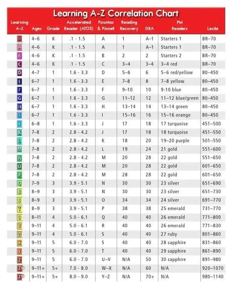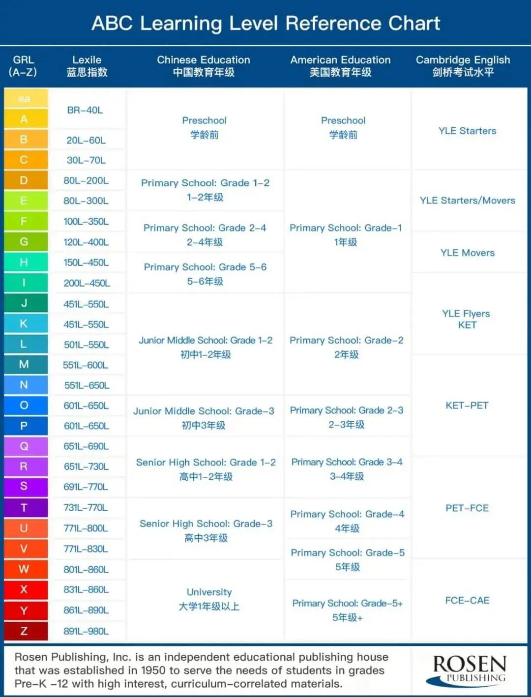 △RAZ的 29 个级别和不同年级学生的水平对应:GK 幼儿园;G1 到 G5 小学1-5 年级;以及 G5+5 年级以上