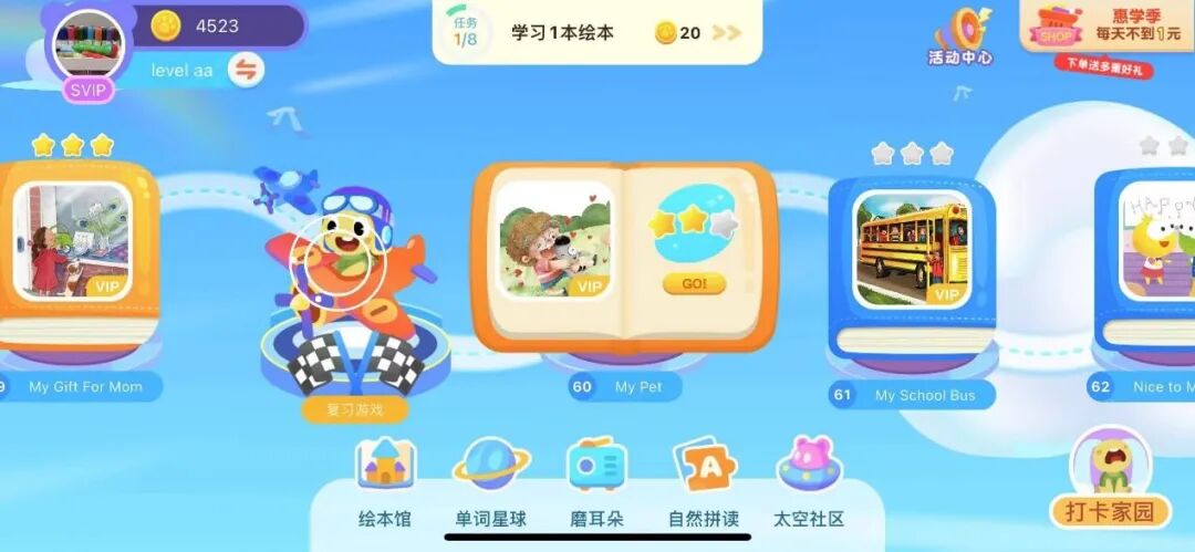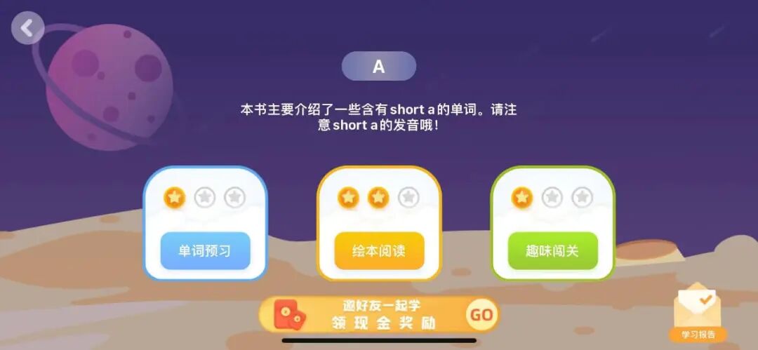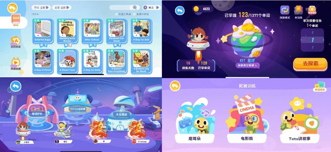 并且,不仅内置 RAZ 绘本,还有自然拼读绘本 400+和伴读动画 800+,以及方便孩子巩固单词的“单词星球”、“太空社区”和训练听说的“磨耳朵”👇