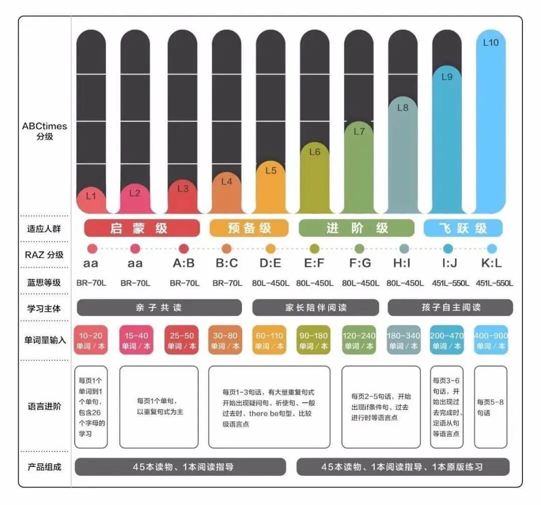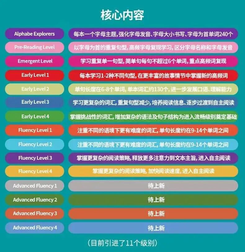 划分为 4 大板块,“启蒙级”、“预备级”、“进阶级”和“飞跃级”,并将原版的 29 级体系变为 10 级体系,由于版权的问题,并且还精减了每级的册数,也没出完,原版 3000 多测只引进了 400 多册,所以目前只适合 3-12 岁的孩子👇