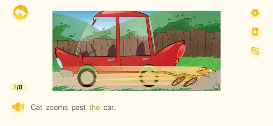 比如 B 级别的 Stop That Cat,再加一个词,把 cat 扩充为 5 个单词的短句,句式统一为“T Cat zooms past the + 一个名词”,末页的句式则变换为“Cat needs a long nap!” 👇