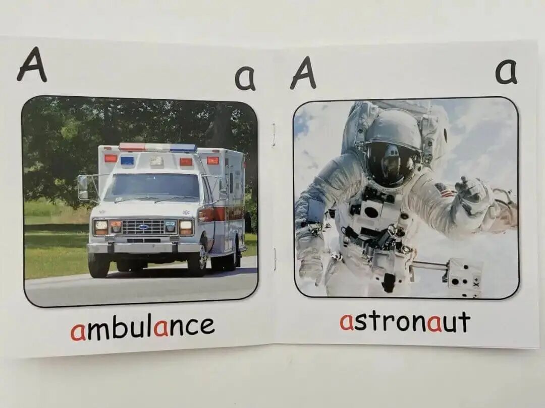 另外,和RAZ一样,红火箭的字母这一册书,每一个单词都配有实物图,所以碰到生词,宝宝也能很容易根据图片猜词意👇