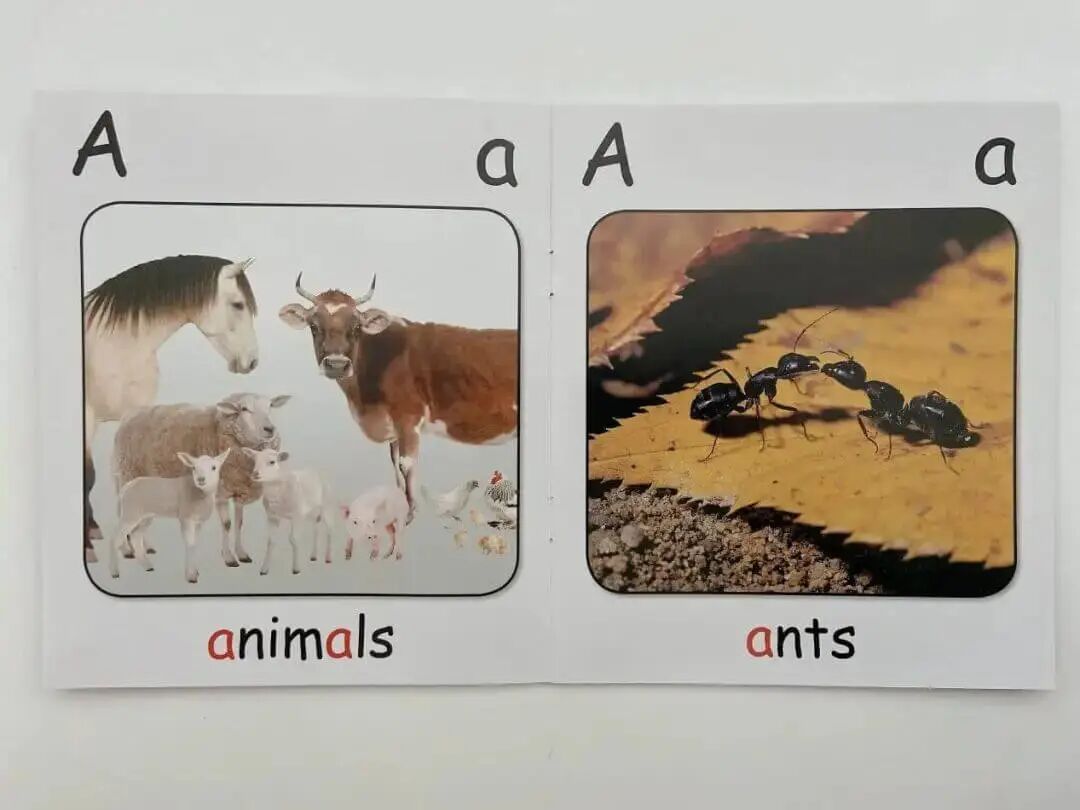 每页顶端都有大小写的A-a、可以帮助孩子熟悉该字母的大小,在单词中出现的A/a也都贴心地被标红,提示孩子这是学习重点👇