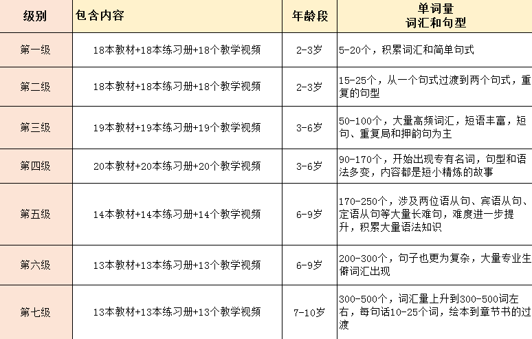 因为英语分级本身就是为了让孩子学习而编排的,所以更加系统和科学,非常符合幼儿的语言学习规律——难度螺旋式上升,由浅到深、从易到难,包括篇幅、词汇分类和句型语法,都有严格的规定。