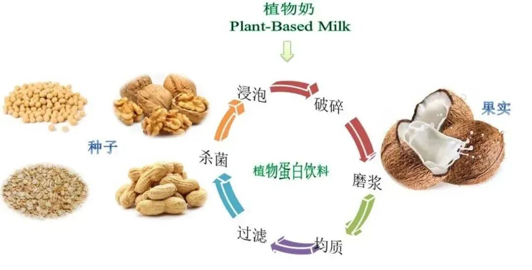 这些含有一定蛋白质的植物,经过浸泡、破碎、磨浆、均质、过滤、杀菌等工艺,加工成一种浓浆类植物蛋白饮品,可以把它们看成是一种「坚果谷物豆浆」👇