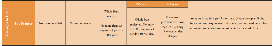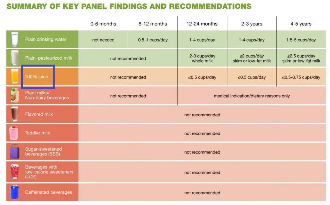 AAP & ADA 等机构共同发布的《幼儿期健康饮料共识指南》(Healthy Beverage Consumption in Early Childhood)中,指出了最推荐孩子喝的饮料,这其中就有100%纯果汁👇