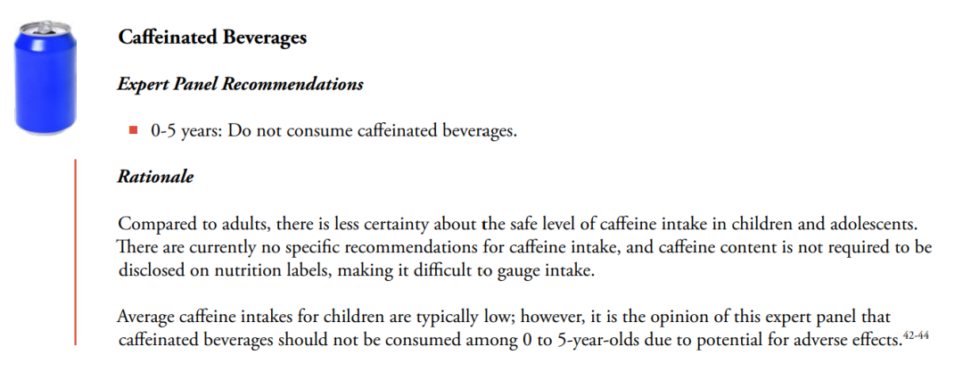 △美国4大权威机构共同发布的《幼儿期健康饮料共识指南》中,明确指出,不建议0-5岁儿童摄入含有咖啡因的饮品